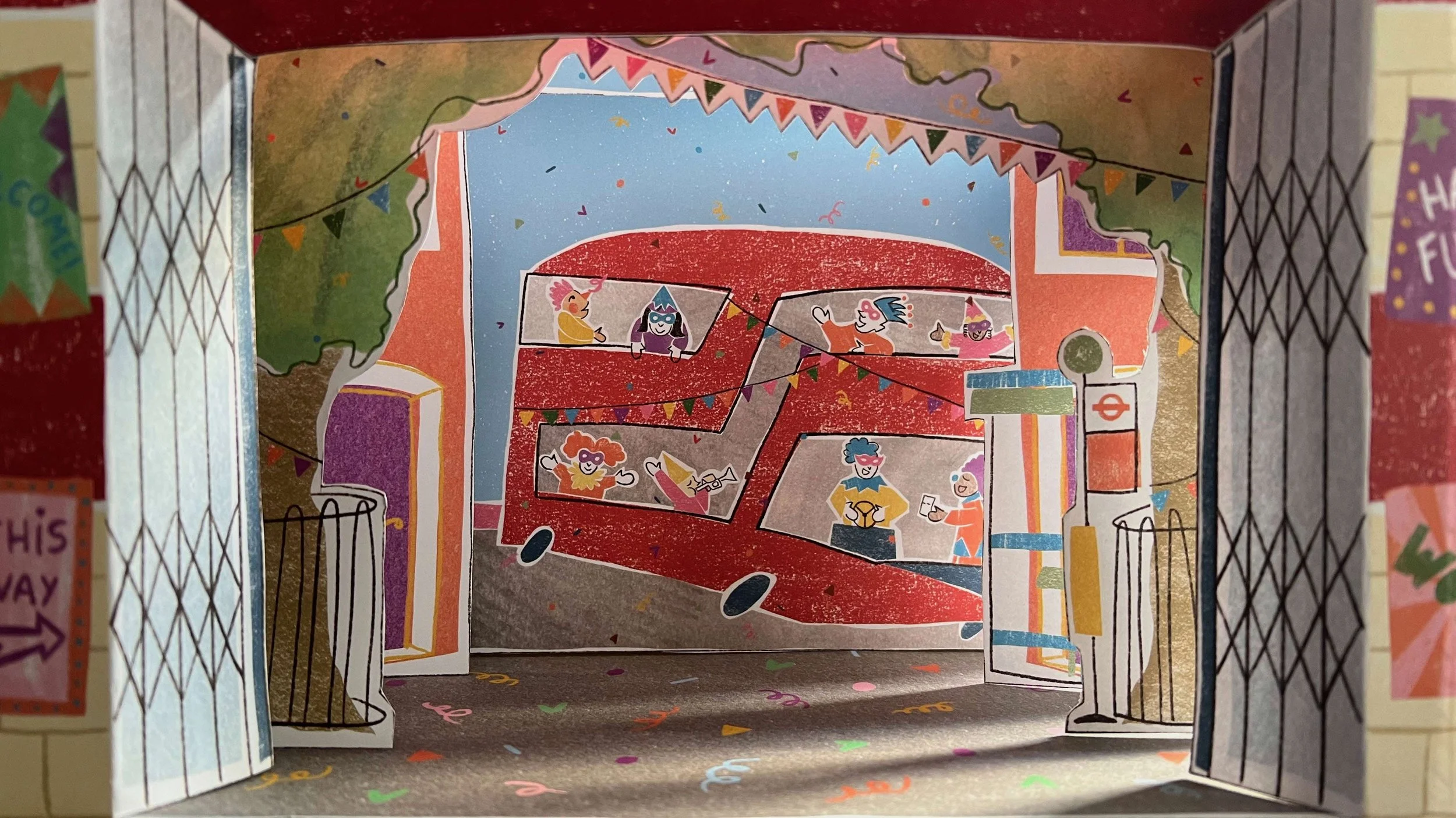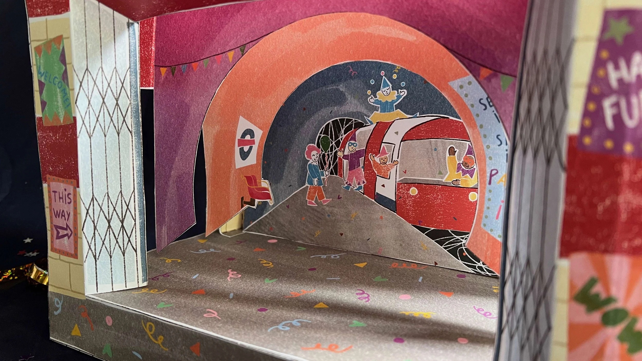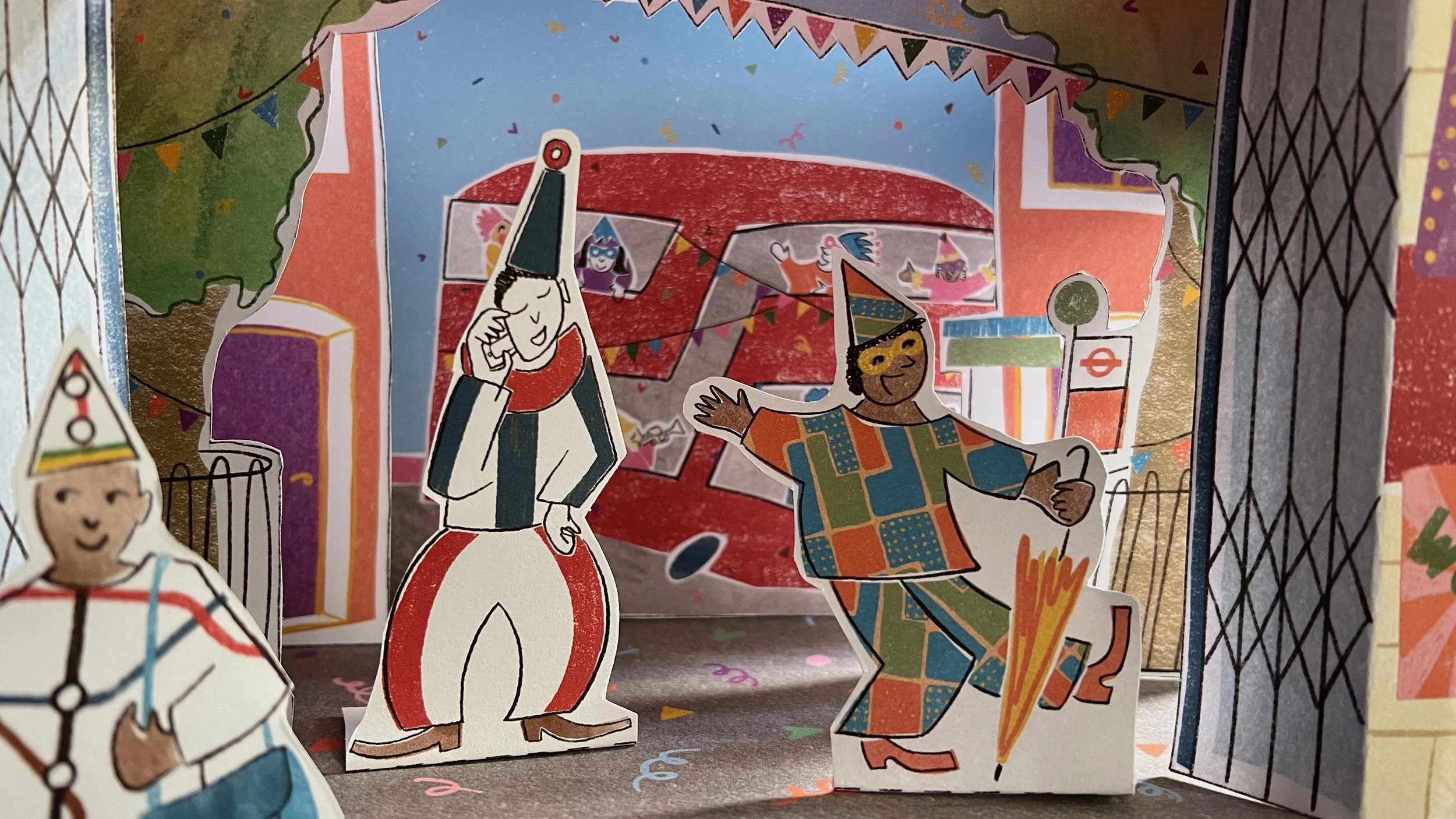 The toy theatre's iconography revisits the traditional carnival motifs with the iconic TfL’s branding imagery.