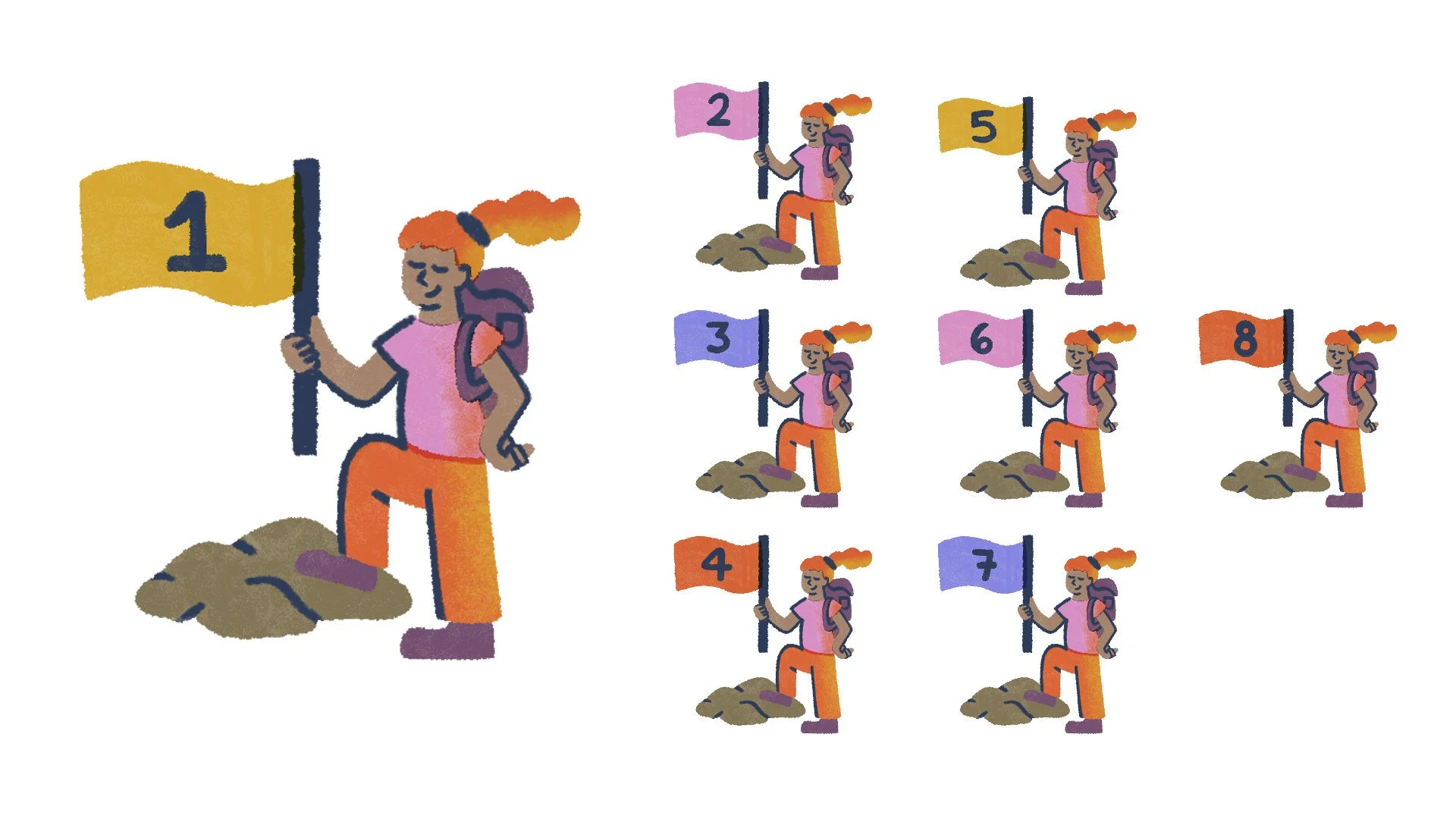 I created a three-part visual narrative: an explorer at the mountain's base (the beginning), eight numbered icons marking the climb (the step-by-step journey), and the summit (when the goals are settled).