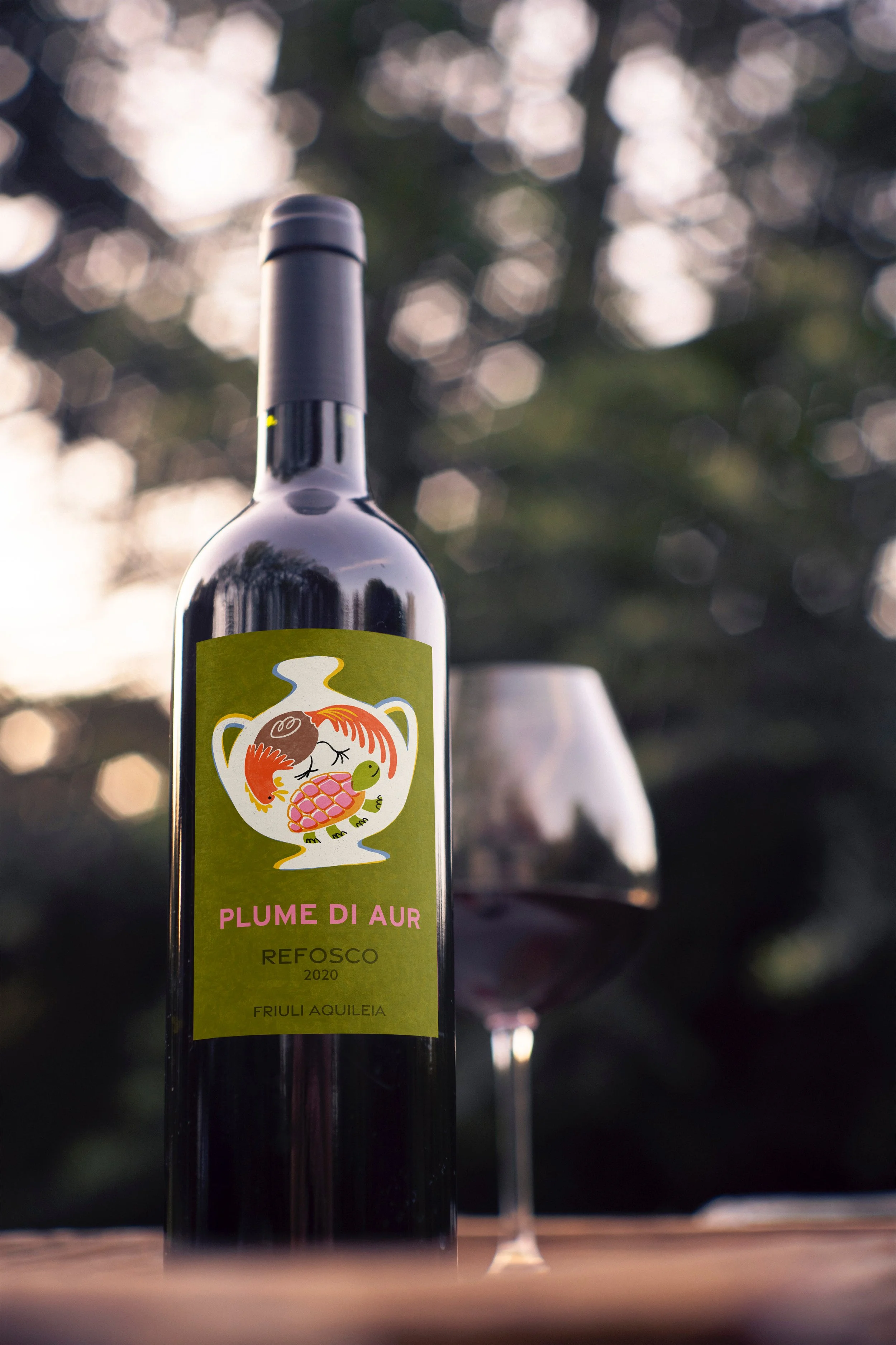 A wine label for a fictional winery in Friuli area, Northeastern Italy. Every element is rooted in the region: the wine itself, Refosco, is a native variety, the name Plume di Aur (“Golden Feather” in Friulian) evokes the golden eagle, symbol of Friuli, and the illustration draws from the famous Roman mosaics of the local town Aquileia, where the tortoise and rooster, symbols of Good and Evil, struggle for the Vase. Together, these choices create a label that is both eye-catching and deeply connected to the cultural identity of Friuli.